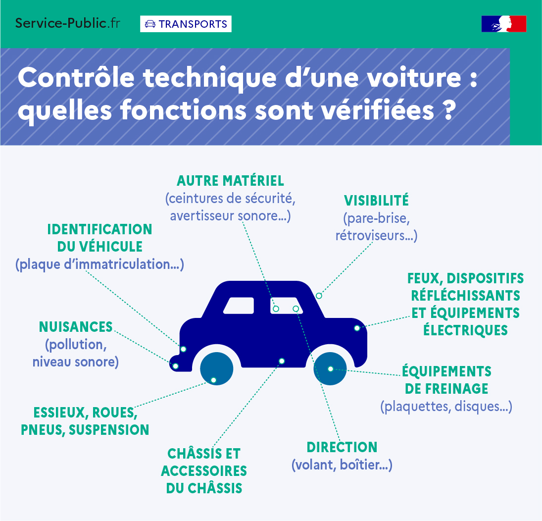 </picture><figcaption class="caption"> Fonctions vérifiées lors du contrôle technique d'une voiture Quand faire le contrôle technique d'une voiture (VP) ou d'un camping-car de 3,5 t maximum (VASP) ? Où trouver un centre agréé ? Quel est le prix ? Quelles sont les fonctions contrôlées ? Dans quel cas doit-on faire une contre-visite ? Nous vous indiquons les principales règles à connaître sur le contrôle technique d'un véhicule de catégorie M1.</figcaption></figure>Les fonctions vérifiées lors du contrôle technique d'une voiture sont les suivantes :