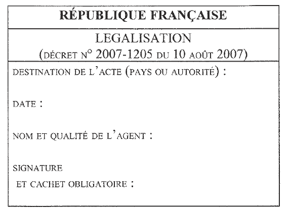 </picture><figcaption class="caption"> Modèle d'apostille Les formalités d’apostille et de légalisation des actes publics établis par les autorités françaises et destinés à être produits à l’étranger seront modifiées :</figcaption></figure>Visuel du cachet de la légalisation