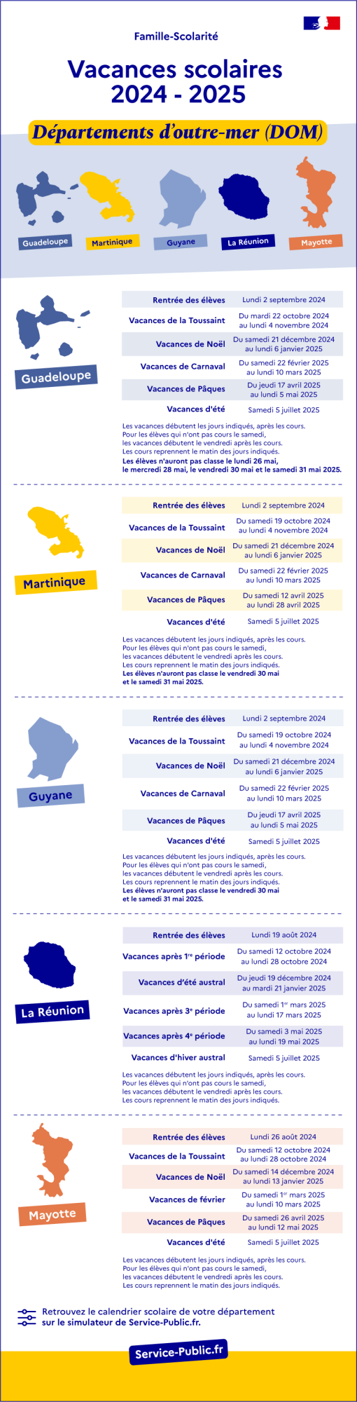 </picture><figcaption class="caption"> Vacances scolaires 2024-2025 : départements d'Outre-Mer (Dom) Service Public (DILA)</figcaption></figure>Départements d'outre-mer (Dom)